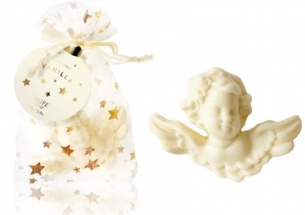 Engelsseife im bedruckten Organzasäckchen goldfarben Gästeseife